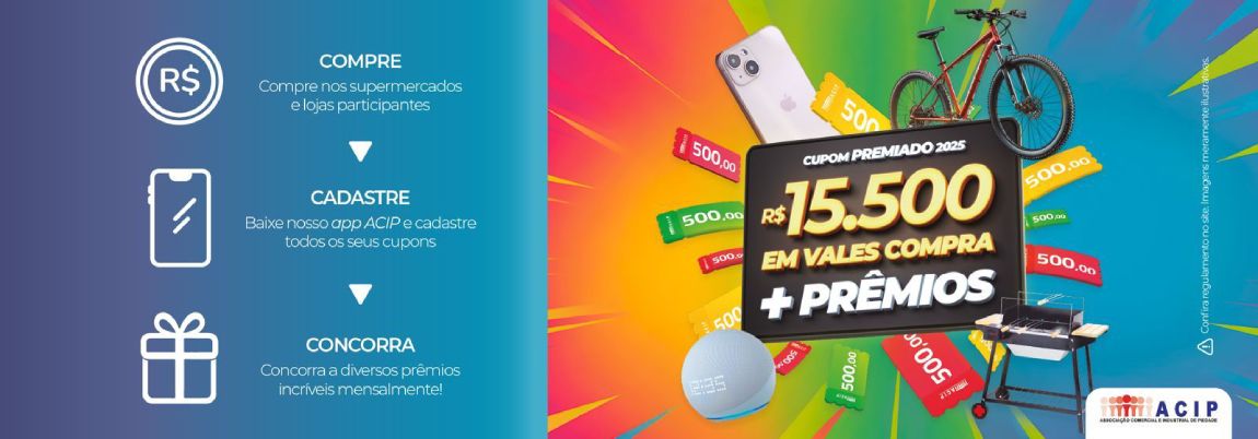 A Associação Comercial e Industrial de Piedade (ACIP) vai realizar a primeira fase da Campanha Cupom Premiado 2025. Serão sorteados mais de R$ 15.000,00 em vale-compras, um iPhone 15, uma Alexa, uma Churrasqueira e uma Bike. Esta primeira etapa da campanha inicia em maio e prossegue até novembro.